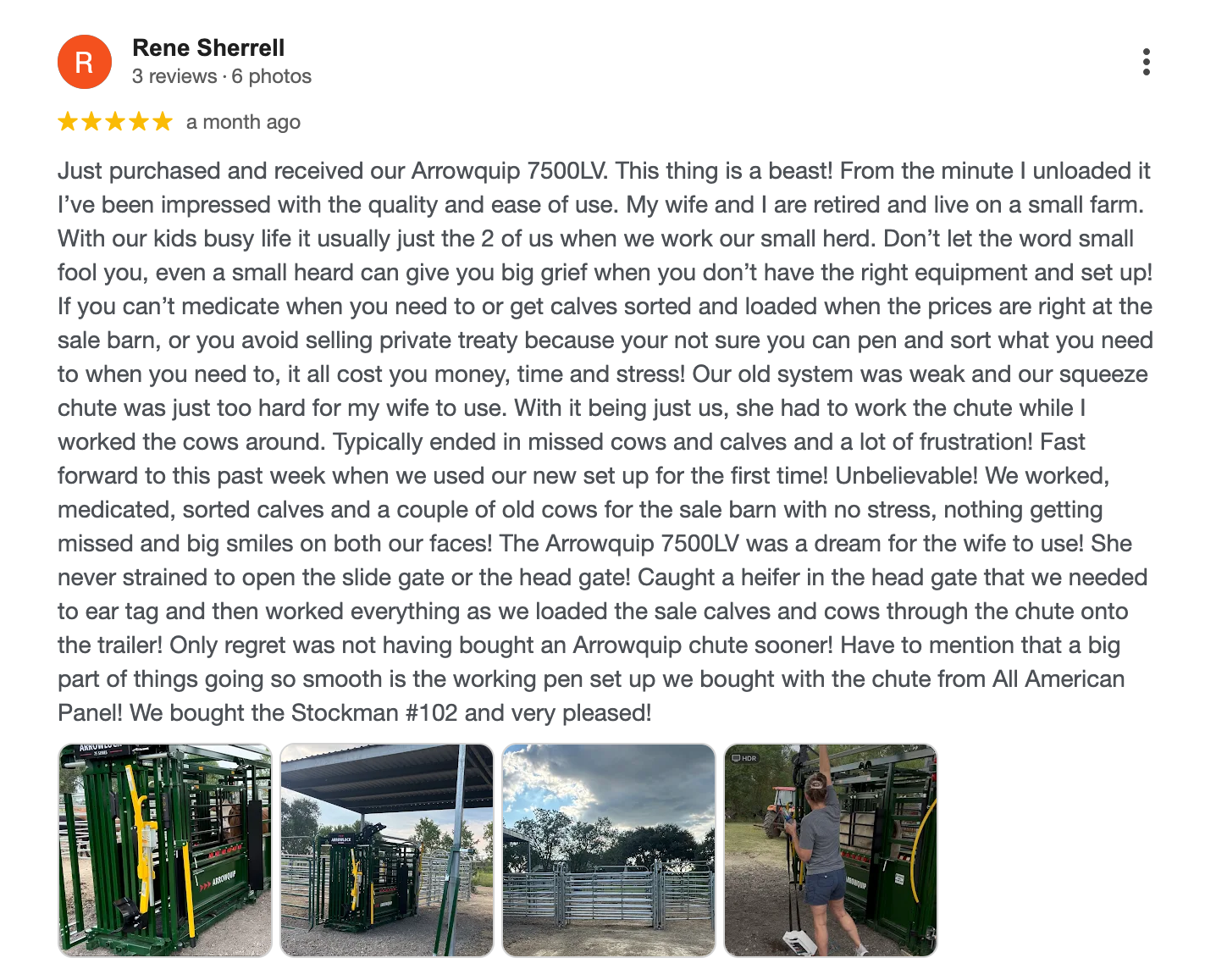 Rancher using the squeeze handle on Arrowlock 75 series squeeze chute with brown cow in head gate